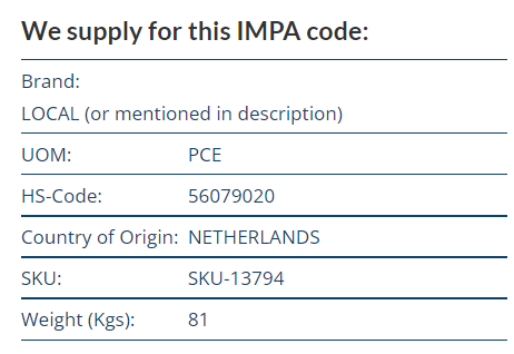 For IMPA code 210110 with official discription 210110-MANILA ROPE 3STRAND, 3″CIRX200MTR we supply code our item description which is sold per PCE and weights 81.