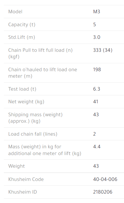 CHAIN HOIST MANUAL from KITO, 5.0TON X 3M LIFT - Double Pawl Spring Mechanism to further increase Sureness In case one pawl spring is damaged, the other maintains functions. This mechanism further increases sureness. - Sure and Reliable Braking Functions (Mechanical Brake) KITO's unique braking mechanism, which has a strong braking power, works instantly when operation is stopped and holds load securely. Moreover, it maintains stability and durability. Little manual power is needed and smooth operation is always obtained, especially when load is being lowered. - Stopper Prevents Excessive Lowering Stopper assembly prevents from excessive lowering of load and also keeps load chain from exiting if over lowered. When you feel a noticeable increase in pull force to lower load you may realize that you cannot lower load any further. - Ultra Strong Load Chain Load chains, the other component comprising heart of the chain hoist, are made of an exclusively developed, heat treated special steel alloy. Carefully selected special alloy steel is processed entirely at KITO's completely automated production facilities under the most stringent quality control standards. All of chains thus produced have a uniformly high breaking stress of 1000N/ mm (100kgf/mm). They have excellent quality including toughness and resistance to wear. - Hooks for Easy Work specially heat treated top and bottom hooks have enough strength and toughness for even hard job. The design of the bottom hook, with relatively large dimensions, makes it easy to stabilize load in proper position.