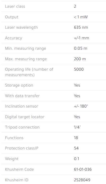 Integrated digital target locator with 4x zoom for accurate locating over large distances, even in strong sunlight - Bluetooth® Smart 4.0 technology for the wireless transfer of measurement data from the laser to a smartphone or tablet. - 360° inclination sensor for flexible measurement from any position (displays ± 180°). - Comprehensive function package – 18 functions (including MIN and MAX tracking, indirect distances and heights, elevation profiles). ISO-certified distance measurer – the measuring range (0.05–200 m) and accuracy specifications (± 1.0 mm) fulfil international standard ISO 16331-1. - Display lighting makes it very easy to read. - Impact-resistant housing with shock-absorbent STABILA soft grip casing. - Protection class IP 54: protection against dust deposits inside and against spray from all directions. 1/4“ thread for fixing on a tripod – makes accurate locating possible.
